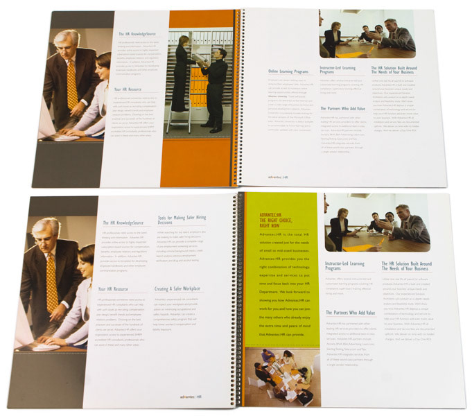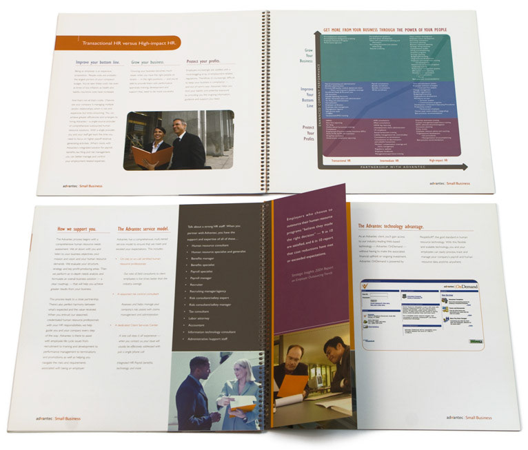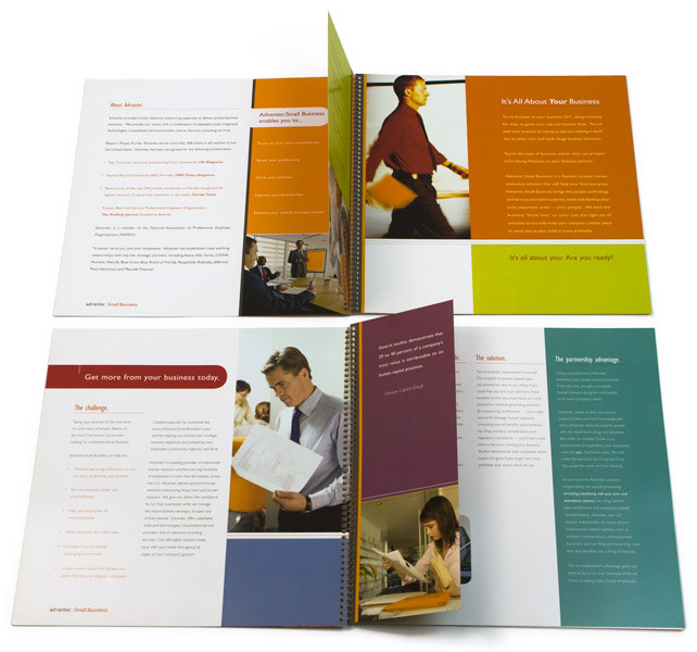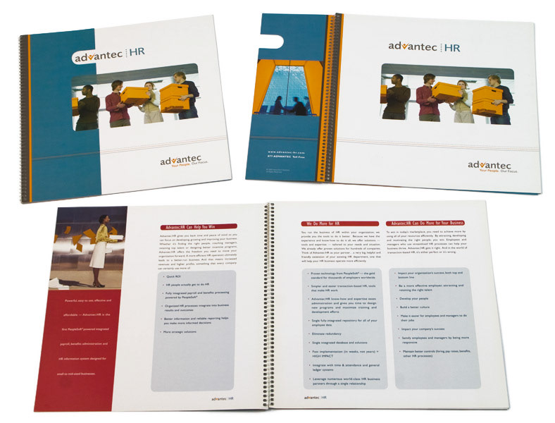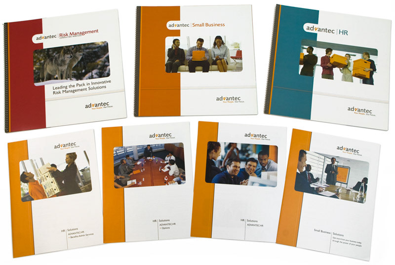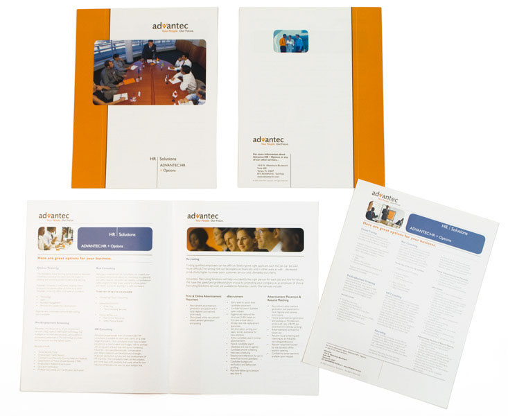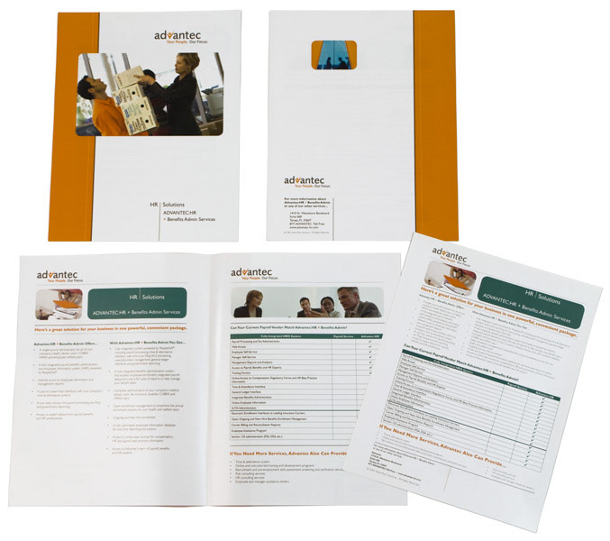 Advantec provides human resources outsourcing expertise to deliver proven business solutions. Based in Tampa, Florida, Advantec services more than 500 employers in 60 markets across the United States. The company needed to create marketing materials in a hurry, as well as get ready for their upcoming conference. Several brochures that also acted as folders were created to highlight different services. A sell sheet template was created to produce multiple sell sheets and case studies on the fly.